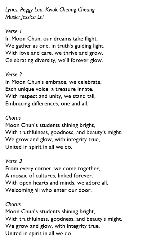 The music was composed by alumna Jessica Lei, whose work was selected from all student submissions in the College Anthem Composition Competition. The anthem is built around a musical motif derived in the key of F, transcribing the letters of ‘Moon Chun’ as ‘F-A-A-G C-Bb-A-G.’